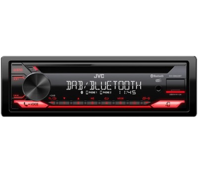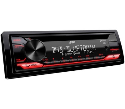 JVC's KD-DB622BT CD Receiver with integrated DAB+ tuner for crystal clear digital radio and Bluetooth technology for hands-free calling and wireless music streaming. Comes with Spotify app and JVC Remote App ready. A large easy to read LCD display will clearly show all information in combination with red key illumination for easy operation. Steering wheel control option is included and a powerful 50 x 4 watt amplifier will boost your systems power output. In case you want to add an external amplifier, 2,5V RCA Preout is waiting on the back panel. Sound quality is ensured by using Full Digital sound processing and time alignment along with a 13 band Graphic Equalizer.