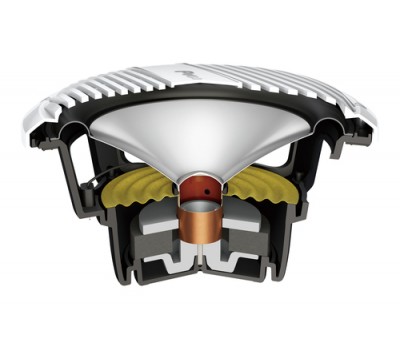 Mica Reinforced IMPP monocoque cone with butyl rubber surround, constructed using an advanced in-mold bonding technique for superior water resistance while maintaining high quality, powerful sound.