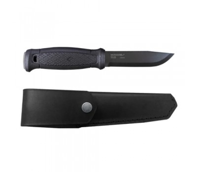 The blade is made of 3.2 mm thick high-quality carbon steel. The DLC-coating is not just aesthetically pleasing but resistant to corrosion and scratching. The combination of Scandi grind and carbon steel makes the knife effortless to resharpen. Both the spine and rear-end are ground to a 90° sharp angle, making it compatible with a fire starter. The black leather sheath has an attractive simple design and is built to last.