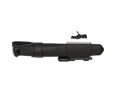 This powerful outdoor knife with a full tang is equipped with a fire starter. The ergonomic barrel-shaped polymer handle features a friction grip, a finger guard, and a 3.2 mm thick blade made of recycled Swedish stainless steel.