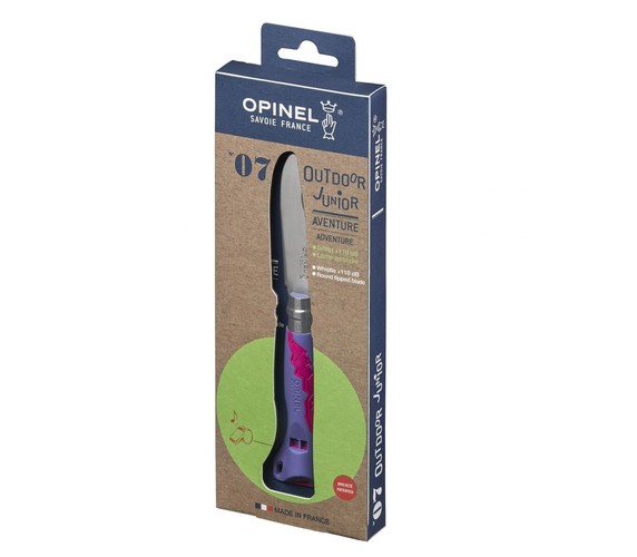 The handle withstands shocks, water and high temperatures. It is equipped with a whistle. The stainless steel blade is solid and sharp. The safety ring blocks the blade in open position and closed position.