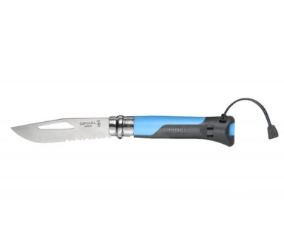 Its very strong blade (2.5 mm thick) is serrated over 3.5 cm to cut natural or synthetic ropes and has a shackle key for 4 to 10 mm shackles. Its handle is water-resistant and whitstands extreme temperatures. It is equipped with a whistle.