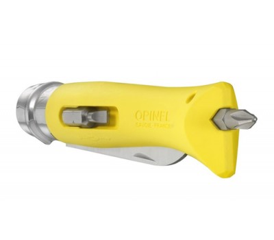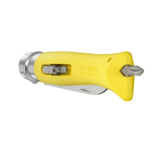 Its extremely robust blade is equipped with a wire cutter (5mm max cable diameter) and with a wire stripper (1.8mm max cable diameter). The handle includes two screwdriver tips.
