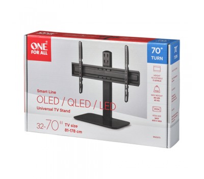 This One For All swivelling and height adjustable Smart TV Stand is suitable for Televisions from 32 to 70 inches and compatible with VESA sizes up to 600 x 400 universaly adjustable. Your television will always be at the right position for optimal TV viewing, with 70° swivelling and five height adjustable positions. With the height adjustment feature you are able to place your soundbar directly under your TV for the best viewing experience! Hide unsightly cables with the integrated cable management system and create a clean and uncluttered look. This modern TV Stand is engineered to assure stability for your TV. All angles are carefully chosen to ensure a low center of gravity.