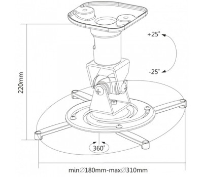 The reflecta Supvex mount especially convinces with its outstanding flexibility, its smart features and elegant design, making it ideal for presentation rooms or your home theatre. The robust aluminium construction safely prevents video projectors from falling down. It can carry beamers with a weight of up to 15 kg. The Supvex mount can be rotated around 360° and tilted by +/-25° in all directions, making it particularly suitable for vaulted ceiling. With this design, you can always optimally align the beamer to the best projection position to obtain perfect viewing quality in any spatial conditions. The fixed distance from the ceiling to the four carrying arms is 22 cm.