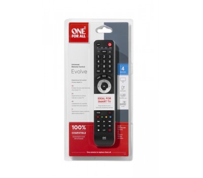 The One For All Evolve 4 universal remote is perfect to control 4 devices (TV, Set Top Box (Freeview, Sat, Cable), DVD/Blu-ray players and Audio devices (Soundbars, Stereos, Amplifiers, etc) with just 1 handy remote. It is optimised to operate Smart Televisions (LED, LCD and Plasma).