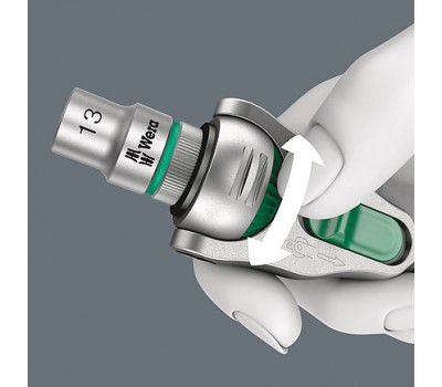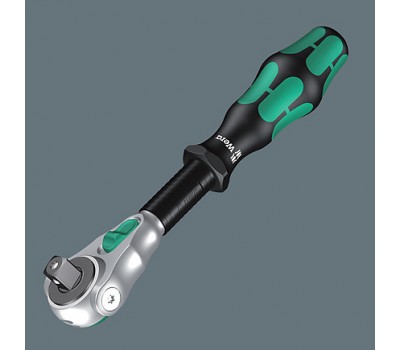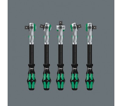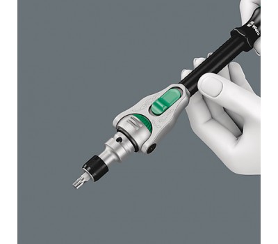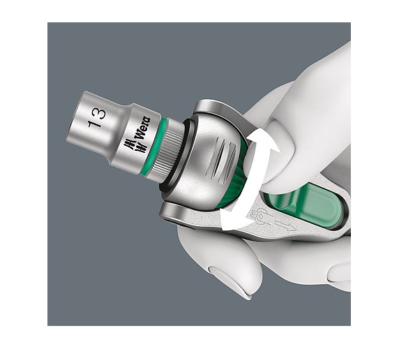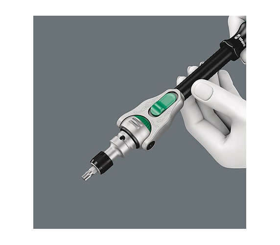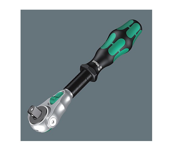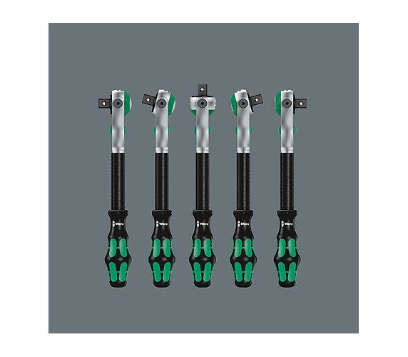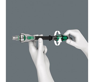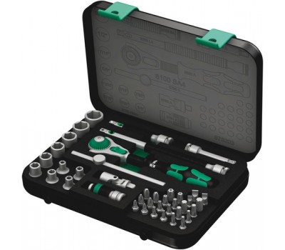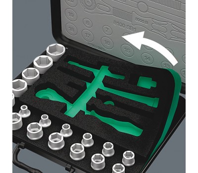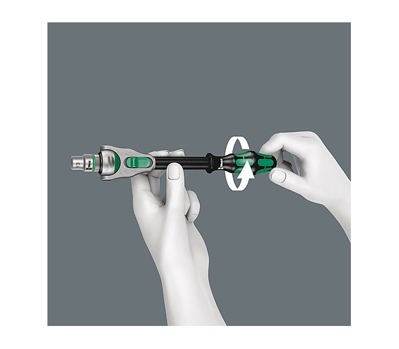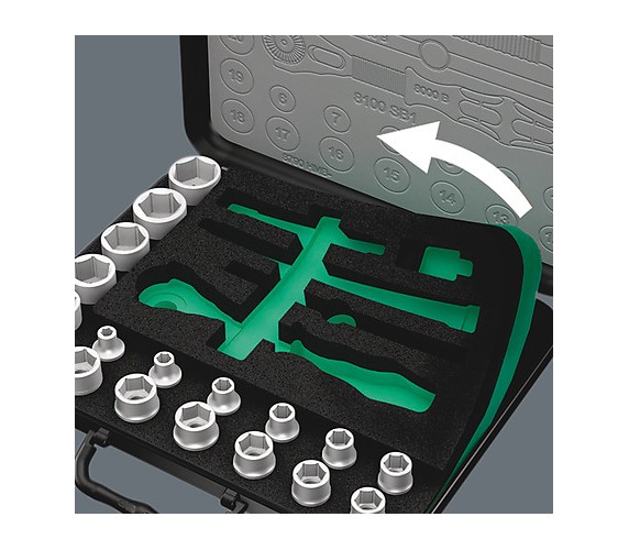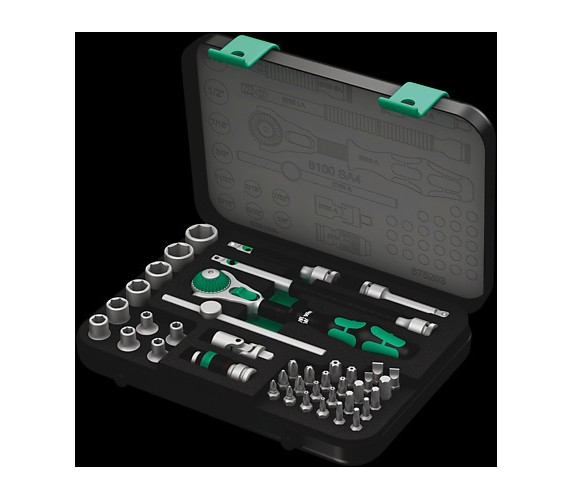 41-piece Zyklop starter set with the essential ratchet components in a robust metal case: Zyklop ratchet with 1/4"drive. The 72 fine-pitched teeth enable a low return angle of only 5°. The ratchet head pivots freely and can be locked into any position by using the slide switch that is positioned on either side. It is even possible to work conveniently in very confined and difficult-to-access areas with enhanced hand clearance. The predefined locking positions at 0°, 15° und 90°, both to the right and left, ensure safe working without any slipping of the ratchet head. The ratchet can be used as a conventional screwdriver in the 0° position by attaching an adaptor and a bit. The flywheel design ensures rapid screwdriving. The rotation-symmetric construction of the Kraftform handle and the free-turning sleeve support rapid twisting. The outstanding design of the Kraftform handle fits perfectly into the hand preventing hand injuries such as blisters and calluses. The hard materials used for the handle ensure quick and easy hand repositioning without any danger of the skin "sticking" to the handle. The softer anti-slip zones enable the low-loss transfer of high torque. For 1/4" square sockets as well as 1/4" adaptors with square drive, equipped with ball lock. Including 10 imperial Zyklop sockets, 2 Zyklop extensions with free-turning sleeve, 1 wobble extension, 1 T-handle, 1 universal joint, 1 adaptor with quick-release chuck, 24 bits. "Take it easy" Tool Finder with colour coding according to sizes.