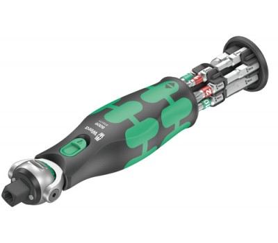 Compact Zyklop ratchet with bit magazine for the pocket. Magnetic direct mounting for ¼" bits and 3/8" sockets. Rapid tool change thanks to the non-locking mounting. As the head is lockable at 0°, 15° and 90°, the tool can be used as a ratchet and as a ratchet screwdriver. The fine toothing with 72 teeth allows for a low return angle of 5°. Wide range of applications thanks to 12 bits integrated in the handle. The robust ratchet mechanism allows for ample torque. Perfect combination of a Zyklop ratchet with a 12-piece screwdriver set.