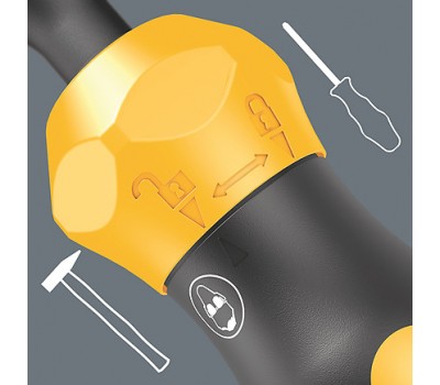 The impact screwdriver 921 combines the advantages of manual impact wrenches, compact tools and screwdrivers with pound-thru blade. The impact wrench function offers a loosening moment of up to 25 Nm. The robust bit holder allows the mounting of different specialised bits for various screw profiles. The pound-thru blade ensures complete power transmission (zero loss). The impact wrench function and screwdriver function can be switched as required.