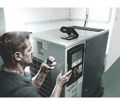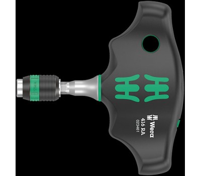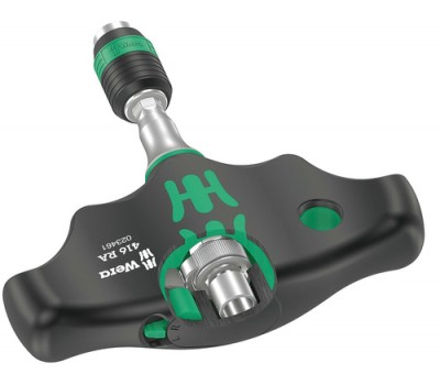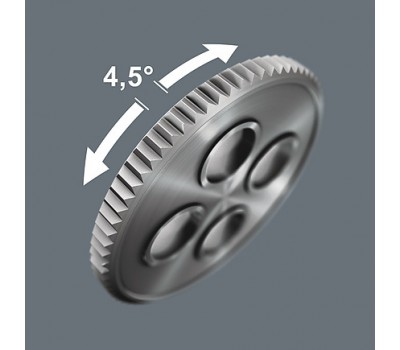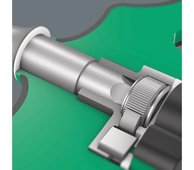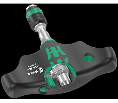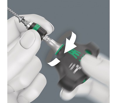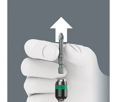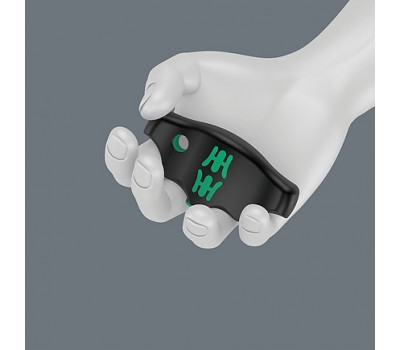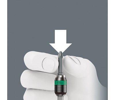 The integrated ratchet with fine toothing (80 teeth/return angle 4.5°) eases and accelerates screwdriving without having to reposition the tool. The ratchet mechanism completely embedded in the handle ensures very handy and comfortable work. With reversing lever for comfortable clockwise/counterclockwise direction change in one-hand operation. The ergonomic shape of the handle fills the ball of the hand well, the fingers lie securely in the softly rounded recessed grips. The whole hand comes into contact with the handle, friction loss between hand and handle is avoided. Bit holder for bits with 1/4" external hexagon drive as per DIN ISO 1173-C 6.3 and E 6.3. With Rapidaptor technology for lightning-fast bit changes.
