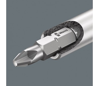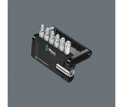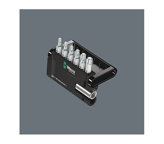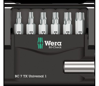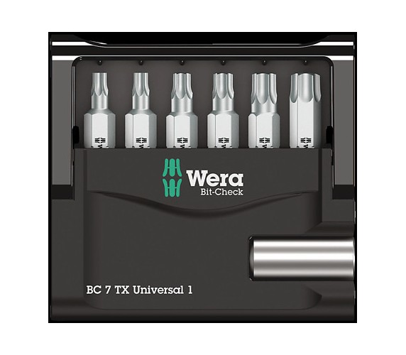 6 Wera TORX® bits tidily arranged in a minimum of space in a practical Bit-Check. Tough viscous Wera bits for universal use. 1 universal holder 893/4/1 K for insertion in the power screwdriver or for use in the chuck of the electric drill.