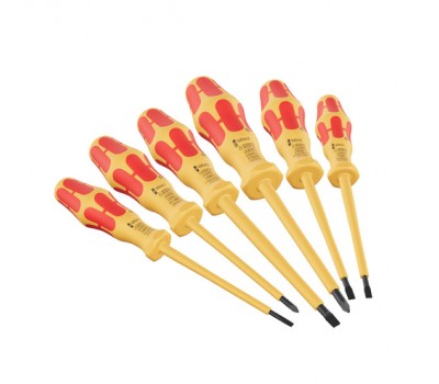 Premium Kraftform VDE screwdriver set. Multi-component Kraftform handle for fast and gentle work. The Wera Black Point tip and a sophisticated hardening process guarantee a long usability for the tip, increased corrosion protection and exact fitting accuracy. Individually tested at 10,000 V for safe working at the approved voltage of 1,000 V. The hexagon anti-roll protection avoids bits from rolling away annoyingly at the workplace. Handles marked to find and sort the tools easily.