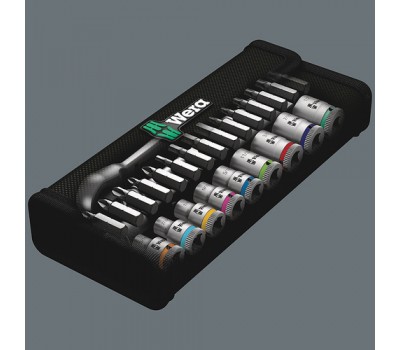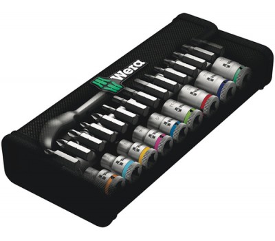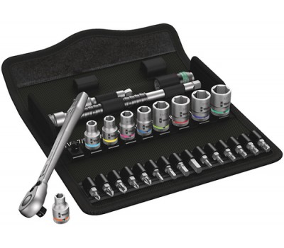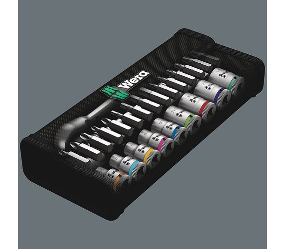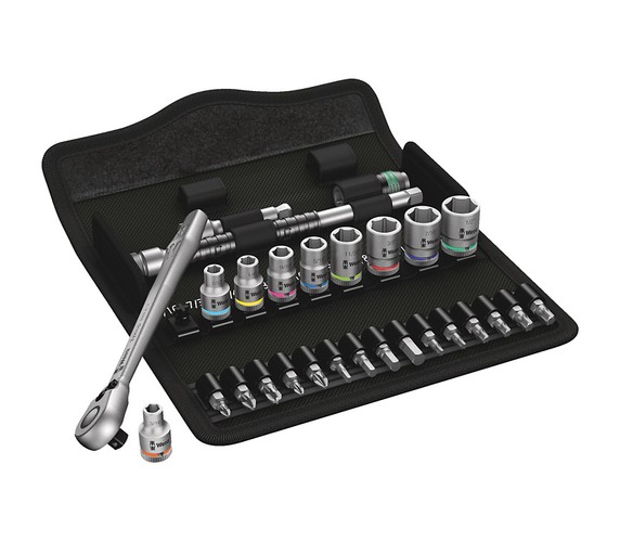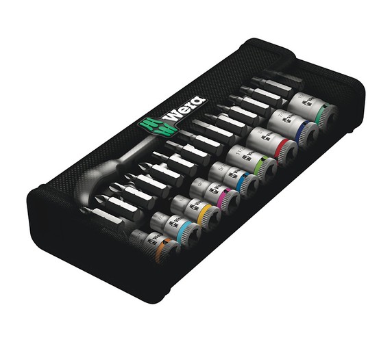 Incredibly compact set arrangement with many tools in a minimum of space. A completely new ratchet set feeling thanks to the unique textile boxes that are very robust and durable. They can be positioned upright for tidy storage on the workshop shelf. Additional surface protection due to textile outer material. Low weight and volume for simpler mobility. "Take it easy" Tool Finder with colour coding according to sizes.