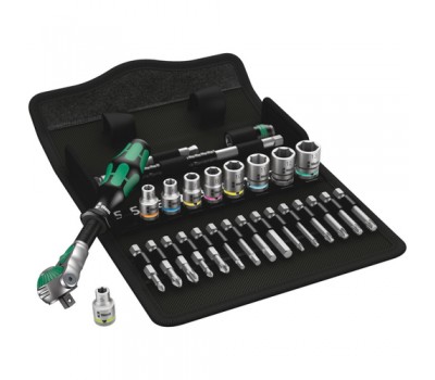 Incredibly compact set arrangement with many tools in a minimum of space. A completely new ratchet set feeling thanks to the unique textile boxes that are very robust and durable. They can be positioned upright for tidy storage on the workshop shelf. Additional surface protection due to textile outer material. Low weight and volume for simpler mobility. "Take it easy" Tool Finder with colour coding according to sizes.