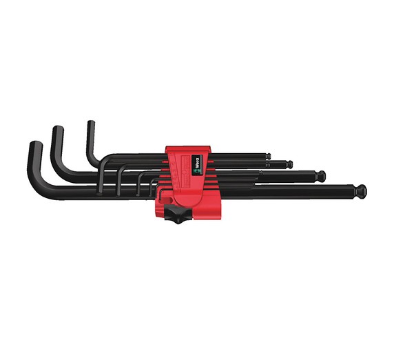 High quality L-key set for hexagonal socket screws in a practical clip fastener out of wear-resistant material, enabling secure storage of the L-keys as well as simple removal. L-keys with Hex-Plus profile: offers a larger contact surface within the screw head. This reduces the notching effects to a minimum and almost completely eliminates the risk of destroying the screw recess. The ball-end on the long arm allows for reliable working even in difficult installation situations. The BlackLaser surface treatment provides outstanding surface protection, even against corrosion, and a long service life. The tools are quickly to hand thanks to the laser-engraved and thereby wear-resistant size markings on the L-keys.