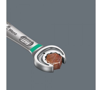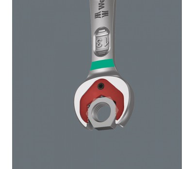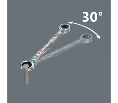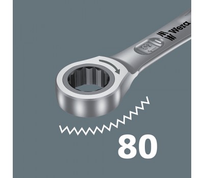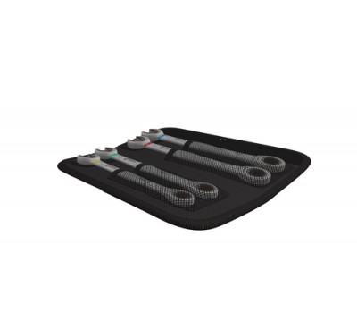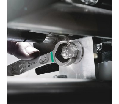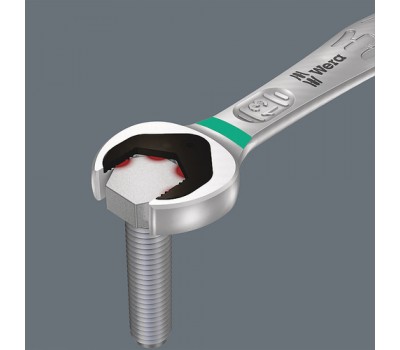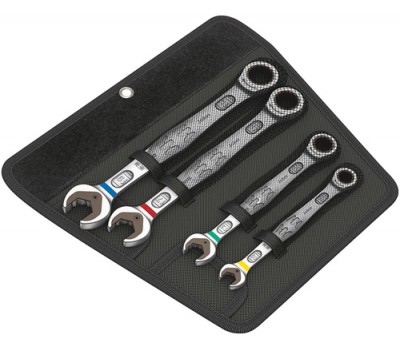 High quality combination ratchet wrench set by Wera: everything that a wrench has to be able to do. And a whole lot more. Faster, better, stylish. Yes, a real Joker. The new generation of combination ratchet wrenches. 4-piece set in a robust pouch. Suitable for hexagon bolt heads or nuts. Comes with a holding function, thanks to the metal plate in the jaw, which reduces the risk of dropping nuts and bolts. The replaceable metal plate in the jaw secures nuts and bolts with its extra hard teeth and limits the danger of slipping. The integrated limit stop prevents any slipping down around the bolt head and allows higher torque to be applied. The double-hex geometry makes for a positive connection with nuts or bolts and reduces the risk of slipping. A return angle of only 30° at the open end prevents any time consuming flipping of the wrench during fastening jobs. The ratchet mechanism at the ring end, with an exceptional, fine-tooth mechanism – 80 teeth in all – enables flexibility even in very confined working spaces. The specially forged geometry provides for high torque transfer and strength. Manufactured out of high performance chrome molybdenum steel with a nickel-chrome coating for high corrosion protection. "Take it easy" Tool Finder with colour coding according to sizes