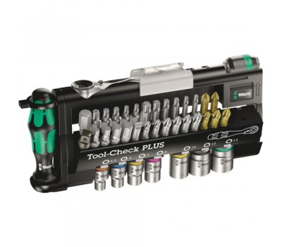28 bits, hand holder 813 suitable for the attachment of bits with 1/4" hexagon drive as per DIN ISO 1173-C 6.3 and Wera connection series 1, Rapidaptor bit holder, adaptor 870/1 (1/4" hexagon to 1/4" square), 7 sockets (1/4"); Wera Bit Ratchet, drop-forged full steel design suitable for the attachment of bits with 1/4" hexagon drive as per DIN ISO 1173-C 6.3 and E 6.3 and Wera connection series 1 and 4; the use of 1/4" sockets is also possible with the application of the Wera adaptor 870/1.
