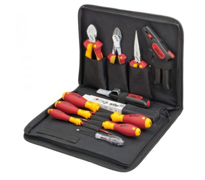 This 12-pc. tool set contains selected hand tools for the most common applications for electricians. Featuring a zip, carrying handle and pockets for hand tools, the fully folding tool bag provides plenty of storage space and an orderly arrangement. The insulated SoftFinish® electric slimFix screwdrivers easily reach even low-lying screws and spring elements thanks to their very slim blades. The tool bag also contains a cable cutter, needle nose pliers and heavy-duty diagonal cutters with DynamicJoint® technology for optimum hand force transmission. Other tools specially designed for an electrician's task field make the tool set complete.