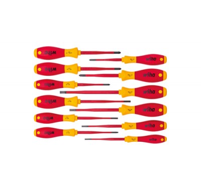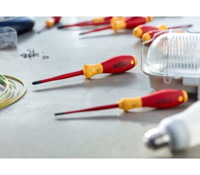 Fastening screws by hand causes considerable strain on wrists and muscles in the long term. The highly ergonomically shaped SoftFinish® screwdriver provides a remedy, ensuring optimal transmission of hand force. The long, slender handle sizes can be used to fasten small screws quickly and firmly. There are also large handle sizes to fasten large screws which can be used to apply greater torques. The various handle sizes have also been matched to the consistently same-sized hand of screw-fastening professionals. The roll-off protection and screw symbol printed on the handle end ensure users work efficiently. Protective insulation has been integrated into the blade with the Wiha slimTECHNOLOGY specially developed for electric applications, thus ensuring blades which are up to 33% slimmer. This means low-lying screw and spring elements can also be easily reached. These insulated screwdrivers undergo routine individual piece testing as per the international IEC 60900 standard, as a result providing users with a tool to work safely on live parts up to 1,000 V AC.