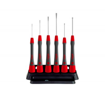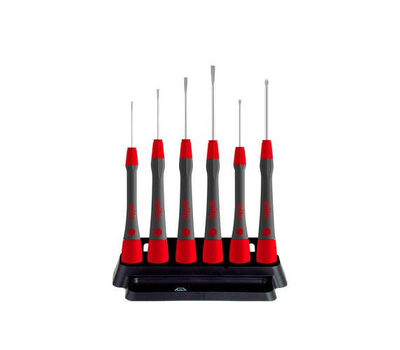 The challenge in precision screw fastenings is to work meticulously and carefully without damaging the work piece. Thanks to their long, slim handles and quick-turning zone, Wiha PicoFinish® fine screwdrivers are ideal for delicate and high-precision tasks in precision mechanics as well as for hobbyists and model building. Its ergonomic handle design with a soft zone makes it comfortable to use. The smooth-running rotating cap allows users to turn the screwdriver quickly and sensitively. The printed screwdriver symbols on the rotating cap make it easier to select the right screwdriver profile. The set contains 6 PicoFinish® fine screwdrivers and a holder. The holder can be used to neatly store the fine screwdrivers at workstations.