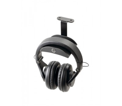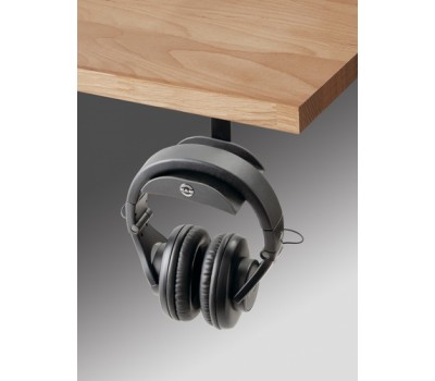 Practical headphone holder that can be mounted under a table. Solid angled metal construction for the comfortable storing of headphones. The large rubberized headphone support protects the headphones from damage and provides a secure hold. Two wooden screws are included with the delivery.