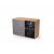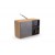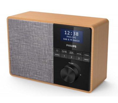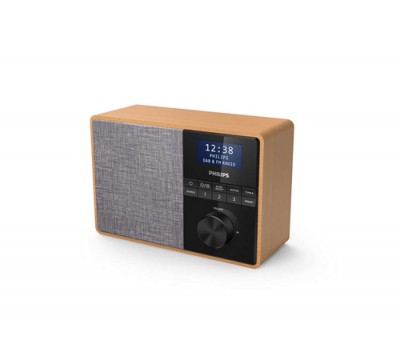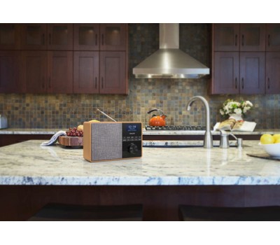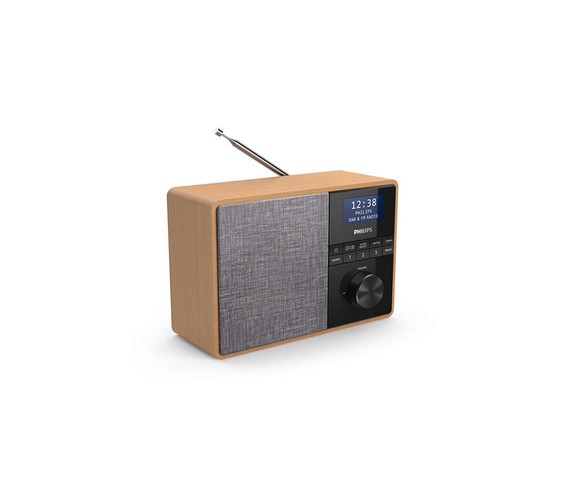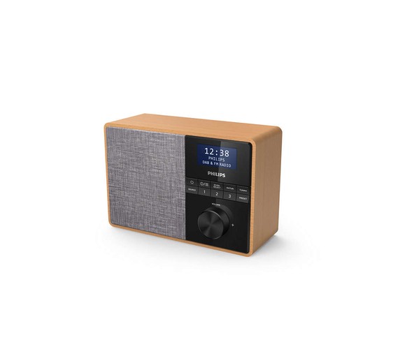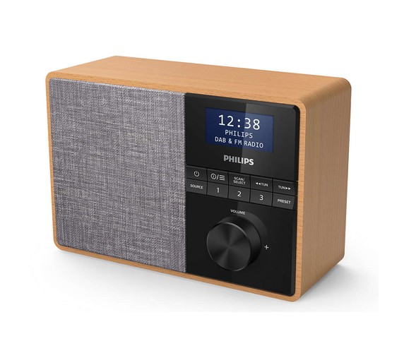 A light wood cabinet surrounds the black gloss display panel and the speaker, which is covered in grey speaker fabric. There are buttons on the front of the radio for tuning, source selection and more. Volume up/down is controlled via the sleek rotary dial.
