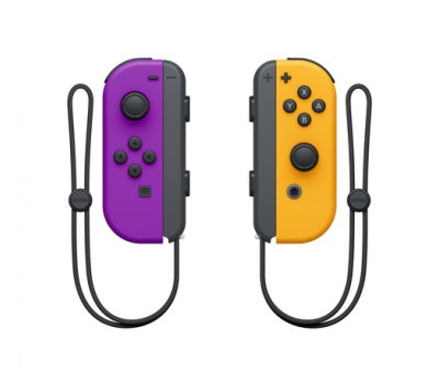 This set includes a Neon Purple Joy-Con Controller (L), a Neon Orange Joy Con Controller (R) and two black Nintendo Switch Joy-Con Controller Straps.