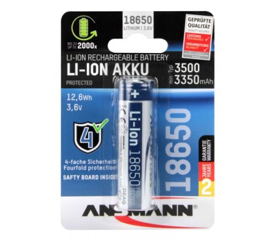 The ANSMANN 18650 Li-Ion battery is extremely long lasting and can be recharged up to 2000 times even under tough operating conditions. With a very low self-discharge the battery keeps its energy for a long time, even when not used. The power to weight ratio is much better than other battery technologies (eg. NiCD/NiMH/PB), with Lithium being much lighter.