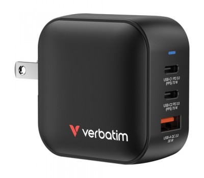 Verbatim's 70W Mini GaN Charger combines two USB-C® and one USB-A port into a compact, pocket-sized design. Capable of charging up to 3 devices simultaneously, the USB-C ports support PD 3.0 (Power Delivery) at 70W while the USB-A port supports QC 3.0. Ideal for the office, home or travelling to power your tablet, smartphone, gaming devices, and more.