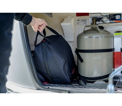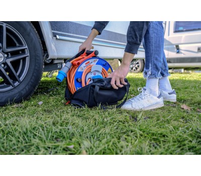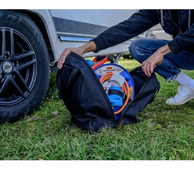 The transport and storage bag for cable reels is made of dustproof and splashproof material and protects the cable reel from moisture and dirt. It is easy to clean and washable so that dirt can be easily removed. The double carrying handle makes it easy to transport.