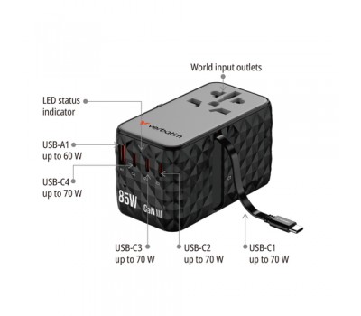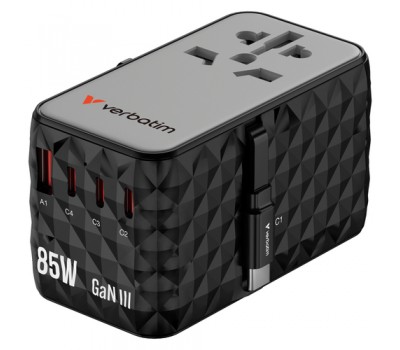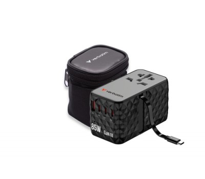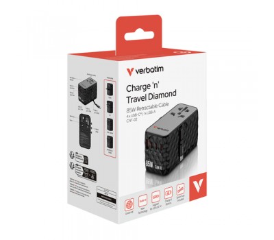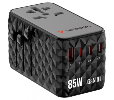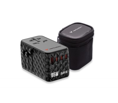 The compact and powerful Verbatim Charge 'n' Travel GaN III Universal Travel Adapter allows six devices to be charged simultaneously through the AC power socket, three USB-C ports, USB-A port and retractable USB-C cable, offering a total output of 85W. Enough to charge phones, tablets and other devices effortlessly.