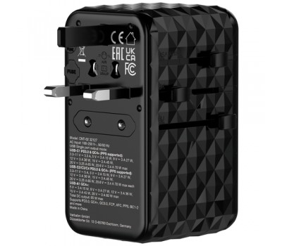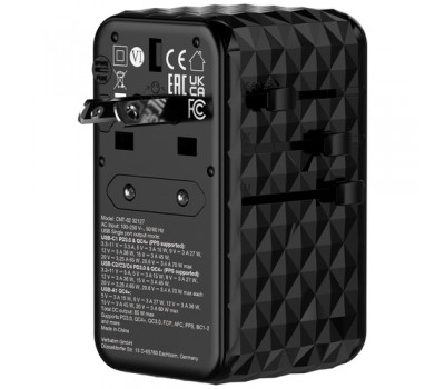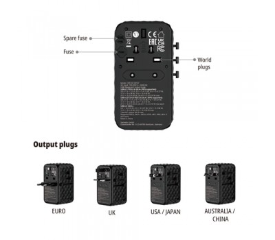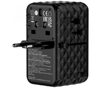 Housed in an attractive black 3D design, the Universal Adapter is made with high quality fireproof polycarbonate material and is certified by CE, UKCA, FCC and ROHS.