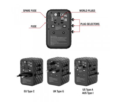 Housed in an attractive black 3D design, the Universal Adapter is made with high quality fireproof polycarbonate material and is certified by CE, UKCA, FCC and ROHS.
