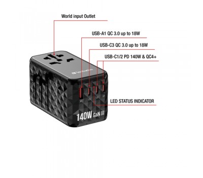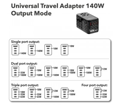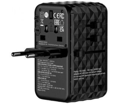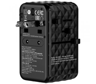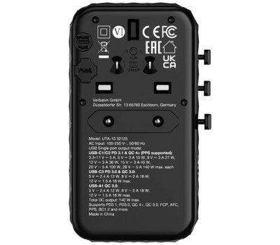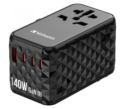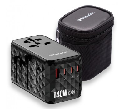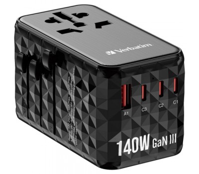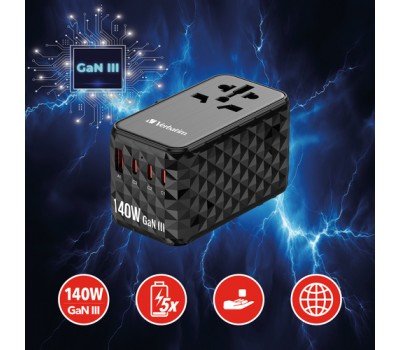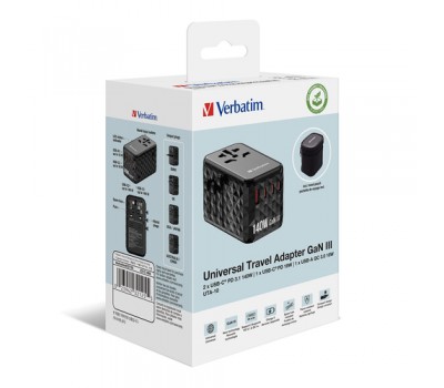 Verbatim UTA-10 140W GaN III Universal Travel Adapter with 2 x USB-C PD 3.1 & QC 4+, 1 x USB-C PD 3.0 & 1 x USB-A QC 3.0 ports (32125)