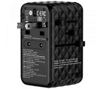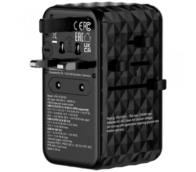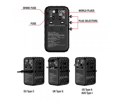 Housed in an attractive black 3D design, the Universal Adapter is made with high quality fireproof polycarbonate material and is certified by CE, UKCA, FCC and ROHS.