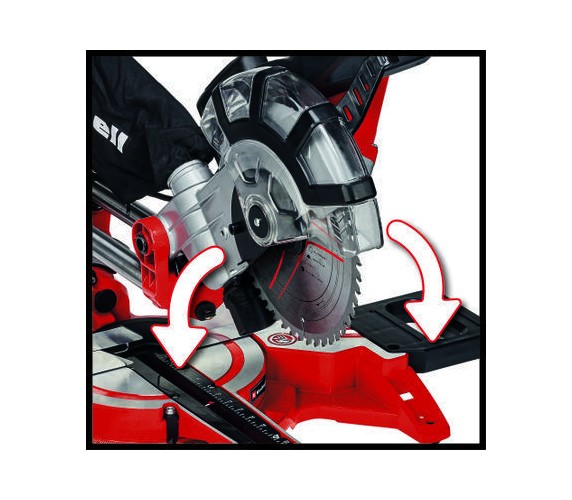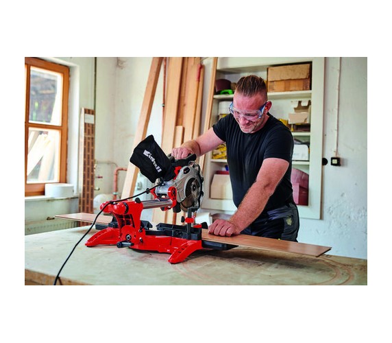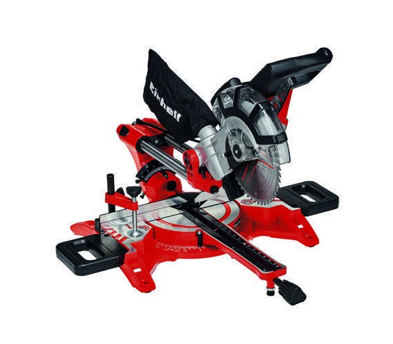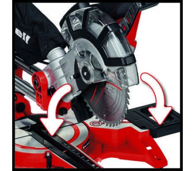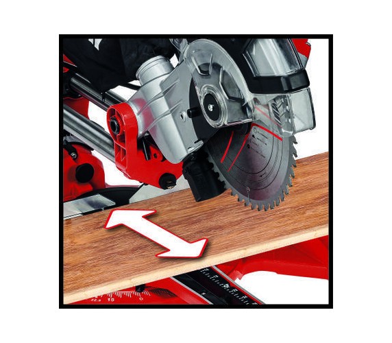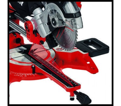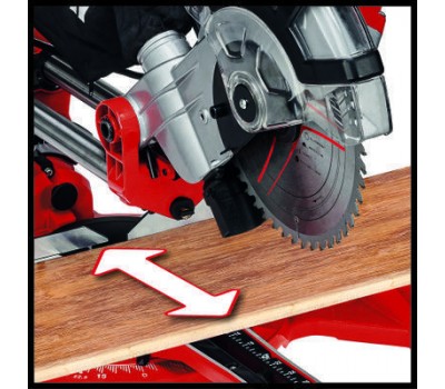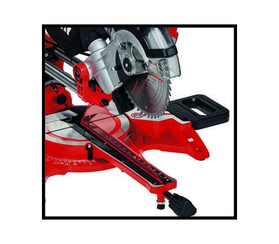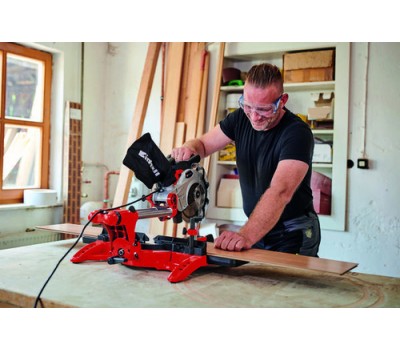 The TC-SM 2131/1 Dual is a drag, crosscut and mitre saw for cutting wood, laminated panels and plastic. The saw head can be tilted continuously to the left and right for high flexibility in setting mitres on two sides. An integrated, mains-powered laser marks the cutting line, enabling the workpiece to be positioned quickly and exactly. The high-quality turntable of the TC-SM 2131 Dual comes with an exact angle adjustment facility for angular cuts which can be latched single handedly in various positions. The integrated drag function enables you to cut particularly wide workpieces. Workpiece supports on two sides, a clamping device for reliable securing of the workpiece and a workpiece stop with rails that adjust to the left and right enable safe, precise operation. The table insert is equipped with a practical scale for reading off the workpiece width. The high-grade carbide-tipped precision saw blade guarantees clean, powerful cutting results. The sawdust bag keeps the workplace clean, while the dust funnel behind the saw blade is another big step up in the effectiveness of sawdust removal. A transport brace is provided for easy and safe mobility.
