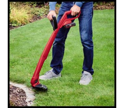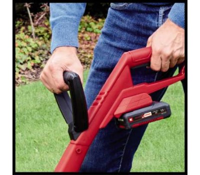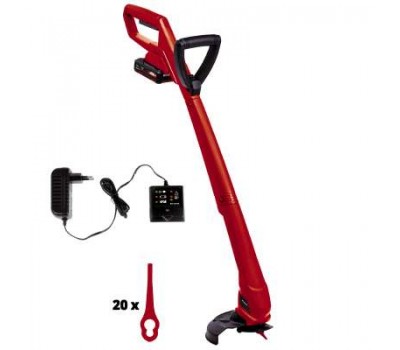 The Einhell GC-CT 18/24 Li P (1x1.5Ah) cordless grass trimmer makes short work of tidying up green edges, strips of grass and difficult corners in the home grounds and garden - cordless and without any restrictions on movement. The cordless grass trimmer is a member of the Power X-Change family, so the rechargeable battery can be used in any of the devices from the system series. The battery which is included enables the user to work completely independently for an operating time of up to 40 minutes. There is a battery charge indicator with three LEDs so that the user can always see the charge status at a glance. Thanks to the additional handle, the grass trimmer can be operated comfortably with two hands. The housing and additional handle have been designed with a particular emphasis on durability, so they are made of impact-proof, high-grade plastic. With a speed of up to 8,500 rpm the cordless grass trimmer is a powerful tool with a cutting width of up to 24 centimeters. The product is supplied complete with 20 plastic blades, one 18 V / 1.5 Ah lithium-ion battery and one charger which recharges the battery within two hours.