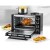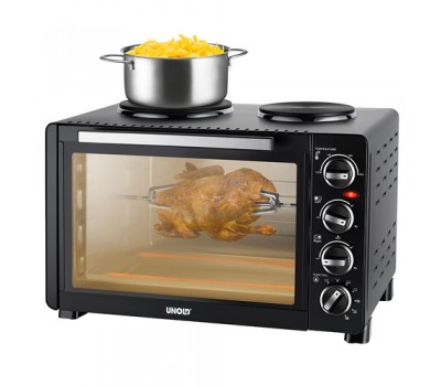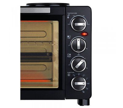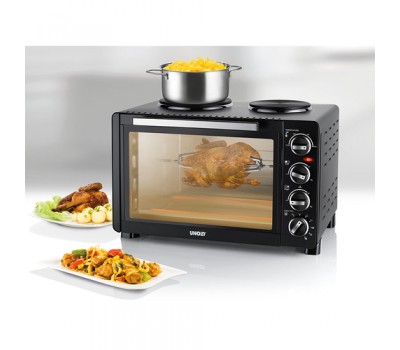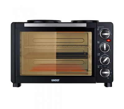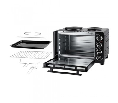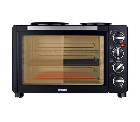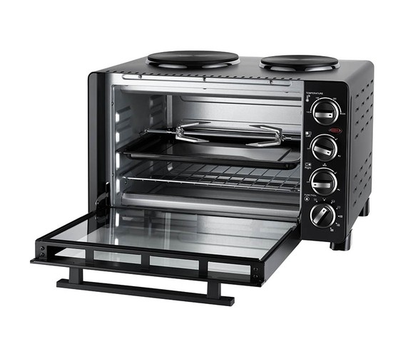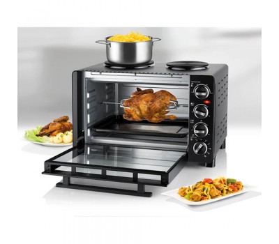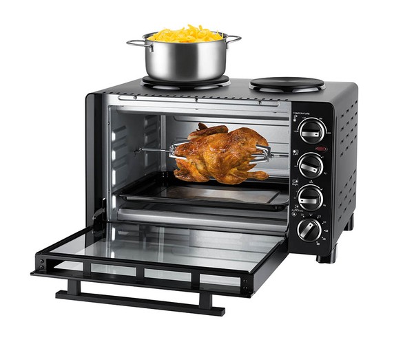 Probably the smallest kitchen in the world: the 30-litre baking, grilling and rotisserie oven with two hotplates. The double-glazed door and the heat-insulated outer casing (in accordance with the latest EU energy standard) ensure energy savings. The hotplates and oven can be used at the same time. The oven interior has space for approx. 25 cm baking or pizza tins, the hotplates have a diameter of approx. 18.5 and 14.5 cm. The accessories include a grill rack and lifter, as well as a baking tray, a rotisserie and a holder clamp for grilled chicken. The operating instructions provide recipes.