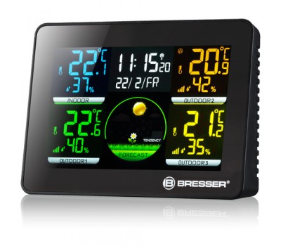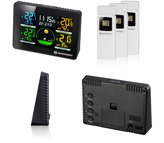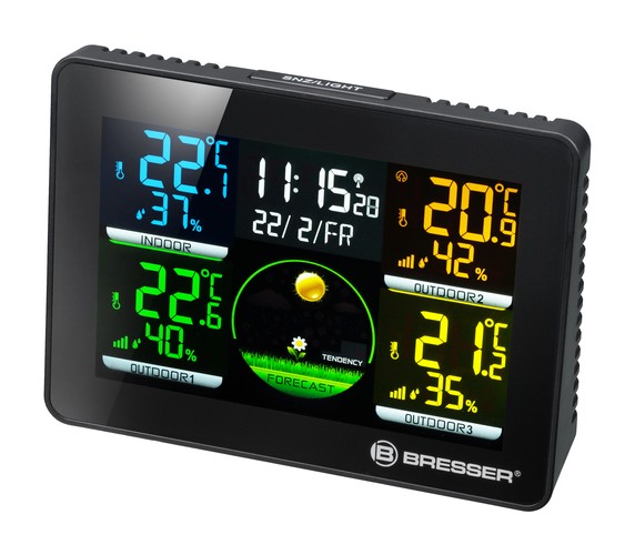 The new BRESSER Thermo Hygro Quadro NLX offers, as with our ClimaTrend Hygro Quadro (Art.-No.: 7000020000000) the possibility to measure temperature and humidity at 4 different measuring points simultaneously. In addition, the weather trend, time and date are shown on the clearly arranged colour display.
