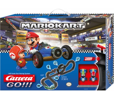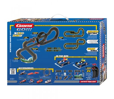 Racing icons in the bedroom • Carrera GO!!! racing set - Nintendo Mario Kart™ 8 • 2x Carrera GO!!! cars in the set: Nintendo Mario Kart™ 8 - Mario and Nintendo Mario Kart™ 8 - Luigi • 5.3-meter racing circuit with high-speed straights, curve, fly-over, loop, narrow section • Dimensions when assembled: 160 x 95cm • Scale of cars: 1:43 • Scale of tracks: 1:43 • Controller with turbo-button • Up to 2 drivers can race simultaneously • Action accessories for great racing fun • Age group: 6+ years It’s pedal-to-the-metal turbo time! Mario and Luigi now have a new race kart and are tearing around the Carrera GO!!! racetrack at top speed. With their new racing cars, the brothers look cooler than ever before. The 5.3-metre/17.38 ft. racing circuit guarantees amazing action with a loop, a fly-over, bottleneck and a junction. Whatever their ages, every Mario Kart™ fan will need supreme contoller skills to claim the ultimate victory.