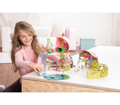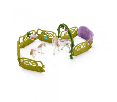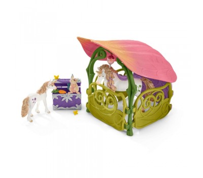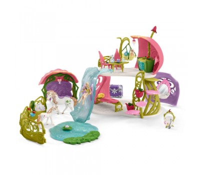 - 1 x house, 1 x unicorn, 1 x unicorn foal, 1 x cloud squirrel, 1 x elf, 1 x stairs, 1 x slide, 1 x swivelling transport basket, 6 x paddocks, 1 x stable, 1 x feeding trough, 1 x lake, 1 x chest, 1 x water lily, 1 x table, 2 x chair, 2 x plate, 1 x bed, 1 x