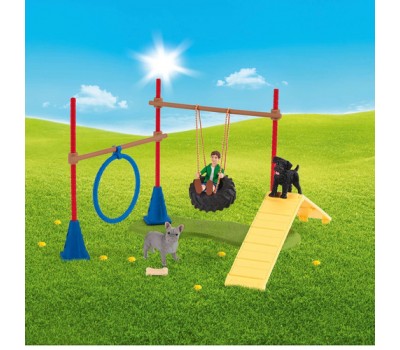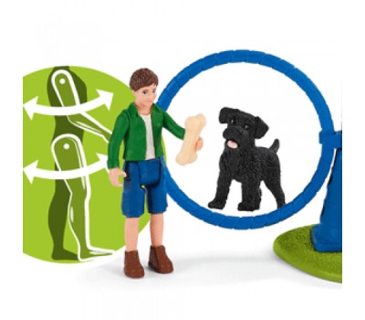 To make sure that his dogs Rosi and Bobby stay fit and can learn cool tricks, FW boy Ben trains them with the new set Puppy Agility Training from Schleich® FARM WORLD! He teaches his bulldog Rosi and miniature schnauzer Bobby how to balance on the seesaw and jump through rings. They improve with every training session. While the dogs share their reward bone, Ben swings as high as he can on his tire swing. It’s so much fun! The set arrangement can be varied and provides limitless playing fun!