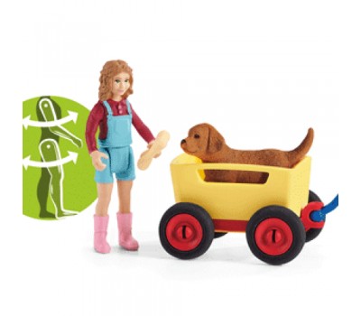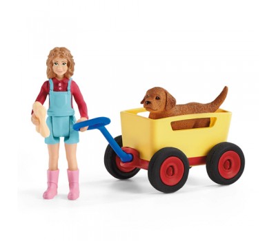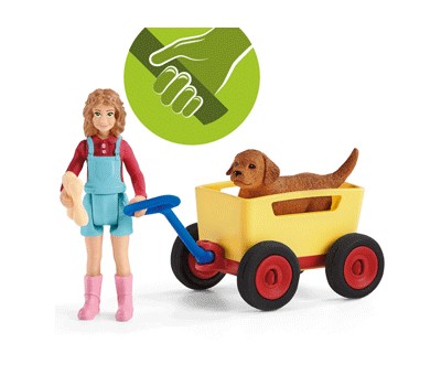 With the Puppy Wagon Ride from Schleich® FARM WORLD, FW Sarah and her puppy Bello have lots of cool adventures. They walk over meadows with colorful flowers, past a field of grain and then to an orchard in the garden of a farmhouse. Here they decide to take a rest, enjoy the fresh air and listen to the chirping of birds. The set is a perfect supplement to the FW set 42408 Adventure Tree House.
