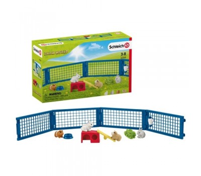 There's plenty to discover in the rabbit and guinea pig hutch from the schleich® FARM WORLD. The animals hide in their hutch, suck at their drink bottle, nibble the lettuce or walk over the rocking toy. This also serves as a practical ramp that they can use to climb or hop onto the roof of their hutch. The fence sections can be connected in any way or combined with other schleich® fences.