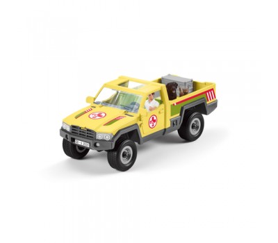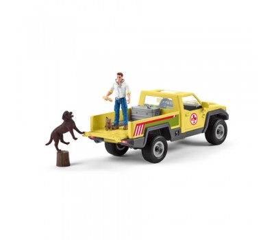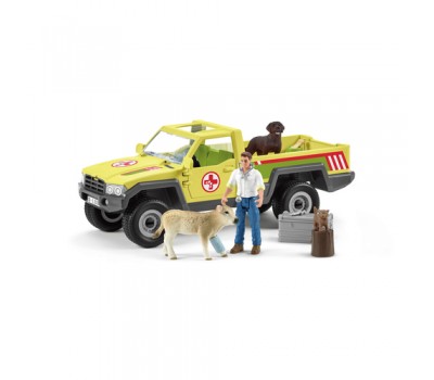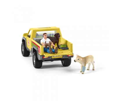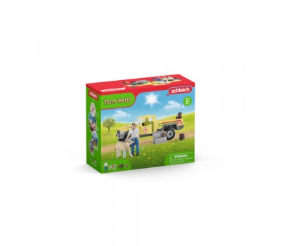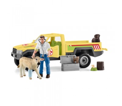 Expansion set for the veterinary practice with pets from the schleich® FARM WORLD. The vet needs to hurry! A calf on the farm is in urgent need of treatment. He jumps in his pickup and rushes to help!