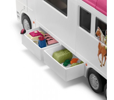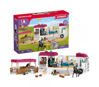 Load up the horses...it's time to travel to the big horse show! Groom your toy horses at the built-in grooming station, or practice the equestrian obstacle course in the modular paddock. Relax in the rooftop pool gather around the barbecue after a long day of training. Perfect for gift-giving, the Horse Transporter is a must-have addition to your Horse Club collection.