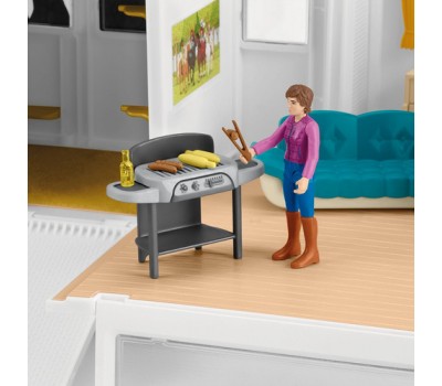 • 1x transporter, 4 car seats, 1x straw inlay, 1x table, 2x chairs, 1x kitchenette, 1x ladder, 4x fence, 4x wooden inlay for fence, 1x horse box seat flap, 2x curtain, 2x wooden inlay, 1x backpack, 1x barbecue, 6x transport gaiters, 1x barbecue tongs, 1x wa