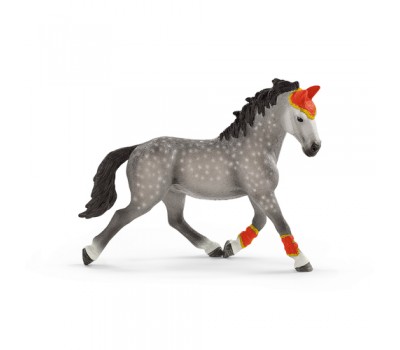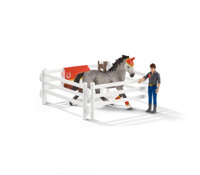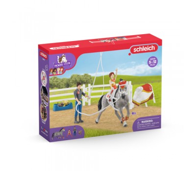 The little girl, Mia, can perfectly prepare for her first competition with the help of the vaulting set by schleich® HORSE CLUB. The male riding instructor, Tom, steadies the show horse using the vaulting harness and gently flicks the whip in his gripping hand so that the horse runs evenly in a circle within the fence parts, which can be plugged in as desired. Hannah's sister, Mia, has moving arms to hold on to and accept the big golden trophy. Saddle, bridle and blanket are removable and stored on the overhead storage shelf after training. The brown kitten watches the events with interest, as she snuggles into her cosy little basket.