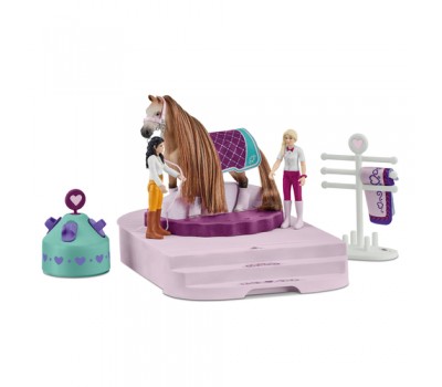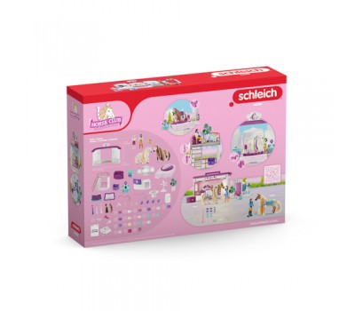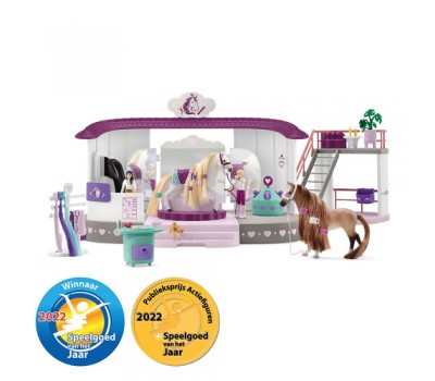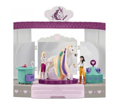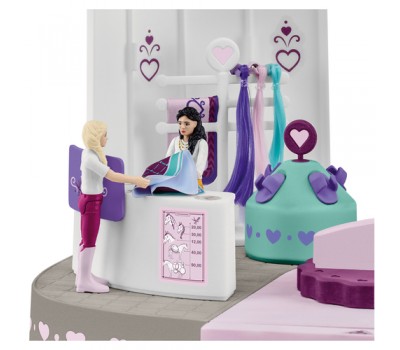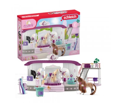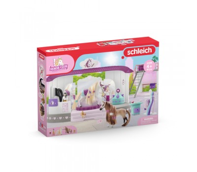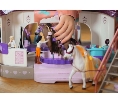 Ever since Mr. Mitchell and Mrs. Lopez-Mitchell opened the Horse Beauty Salon in Springdale City, the city's equestrians have gone gaga over trendy hairstyles for their horses. The six-piece playset is part of the new Sofia's Beauties line from Schleich Horse Club. It includes a salon with turntable, two toy horses with brushable manes and tails, two posable characters, and even a Maltipu puppy figure. Horse-y fun just got glamorous!