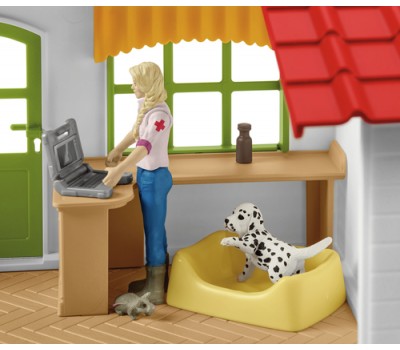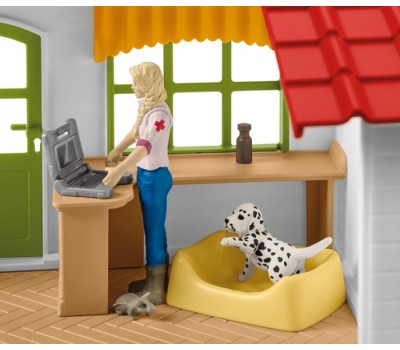 - 1x vet practice, 1x vet, 1x Haflinger foal, 1x Dalmatian puppy, 1x kitten, 2x rabbit, 1x mouse, 1x dog basket, 1x blanket, 1x bowl, 1x drinking bottle, 1x feeding rack, 1x bone, 1x carrot, 1x laptop, 1x vet\'s case, 1x medicine bottle, 1x stethoscope, 1x